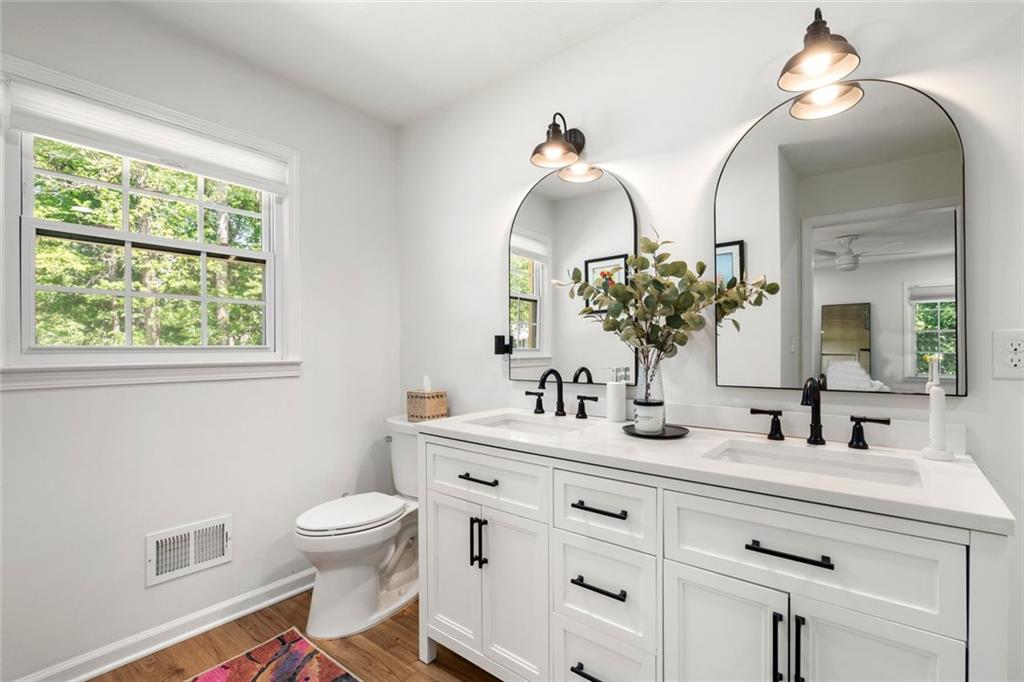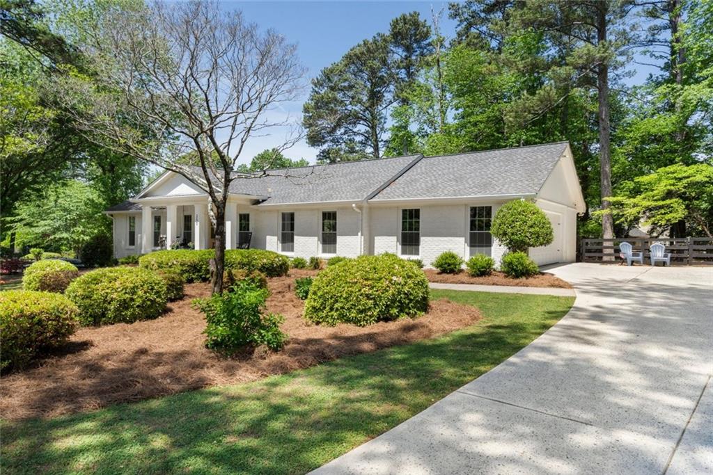 This beautifully updated paintedbrick ranch in the heart of Roswell is the one you've been waiting for. A gated front yard leads guests to a covered porch, perfect for greeting visitors, and high ceilings combined with expansive windows flood the main living area with natural light. The seamless open floorplan flows from a cozy woodburning fireplace to a formal dining space and a builtin office nook with bookshelves. In the gourmet kitchen, quartz countertops, an island with storage, gas range, stylish light fixtures, tile backsplash, pantry, and breakfast area offer both form and function. On the main floor, the generous primary suite boasts two closets and a renovated bathroom with a framelessglass shower, double quartztop vanity, and updated lighting, while two additional bedrooms share a fully updated bathroom with a tub, quartz vanity and stylish tile. The surprisingly spacious terrace level features a living room perfect for TV or play, a guest bedroom, full bath, a flexible bonus room currently used as an additional bedroom, and an open area ideal for an office, gym, or craft space. Outside, the fenced backyard is ideal for summer barbecues and private relaxation, and the location offers easy access to shopping, unique dining, parks, and the vibrant downtown Roswell scene. Fully updated, thoughtfully designed, and movein ready, this ranch blends charm and modern amenities for the ultimate Roswell lifestyle.